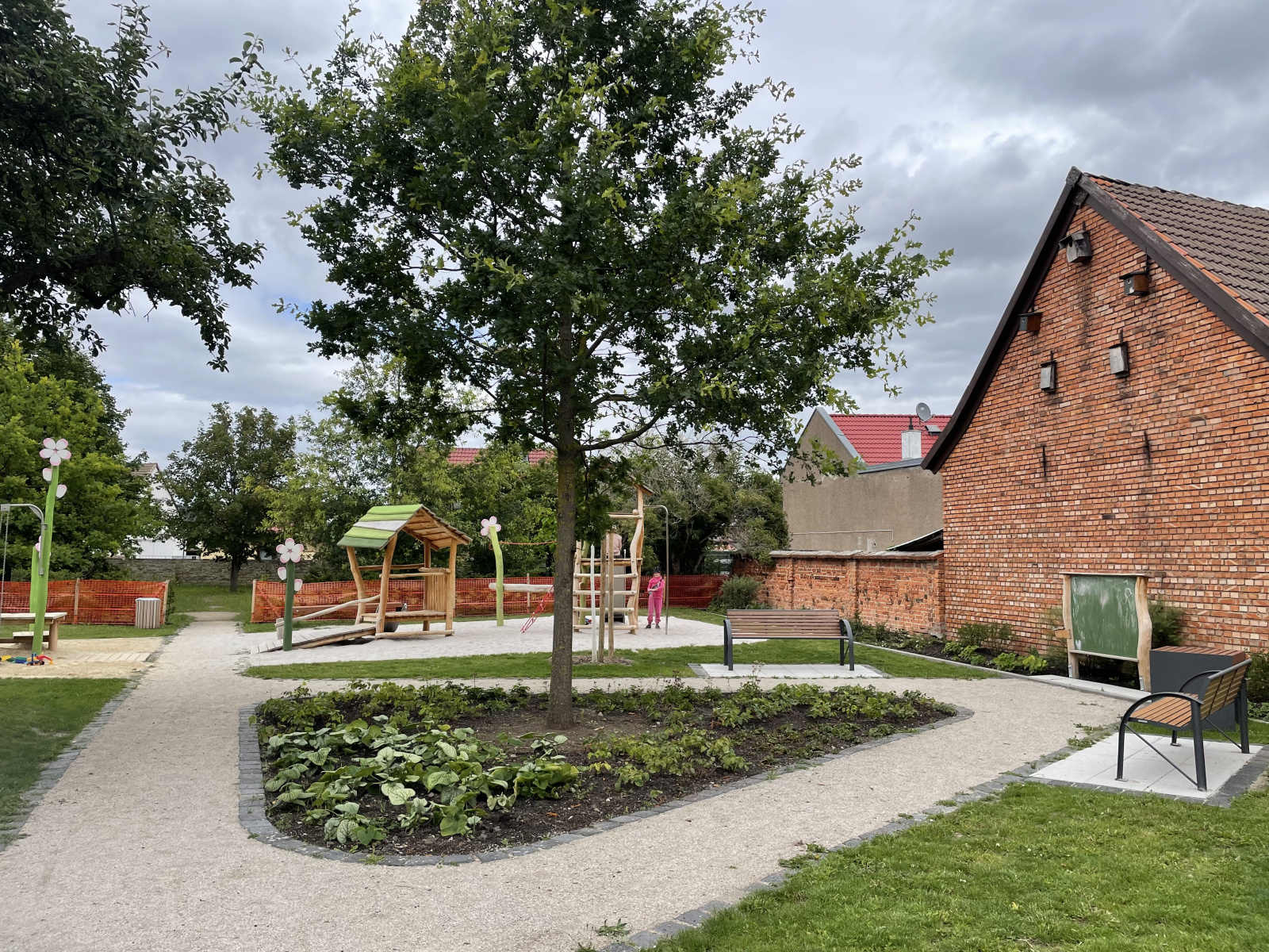 Der bestehende Sitzbereich am mittleren Wegedreieck wurde als Generationentreff aufgewertet und durch Einbauelemente wie eine Maltafel und einen Tisch ergänzt. Die alte Rasenfläche um die bestehende Eiche wurde in eine Pflanzfläche mit Blühstauden und Bodendeckern umgewandelt. Die neuen Holzsitzbänke verfügen über Rückenlehnen und seitliche Armlehnen, um den Komfort auch für ältere Nutzer zu erhöhen.