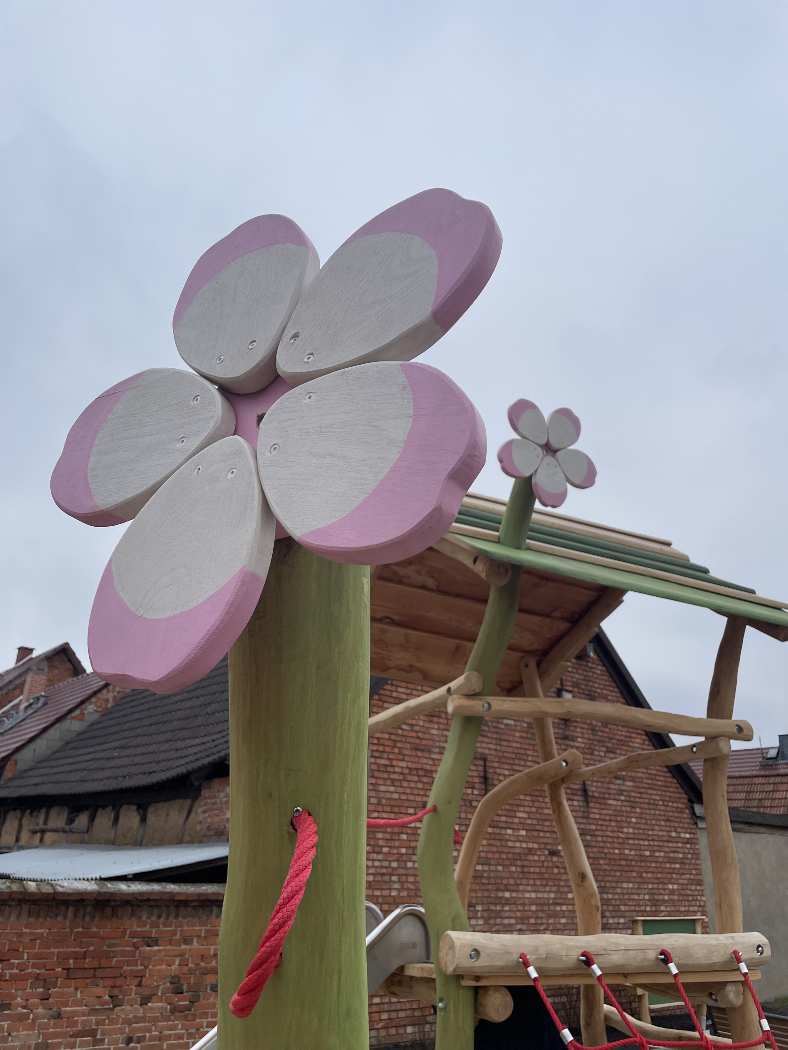 Die zentrale Spielinsel besteht aus einer Spielfläche mit verschiedenen Bewegungsangeboten wie Spiel- und Kletterturm, Holzsteg, Minirutsche etc. sowie einer separaten Sandspielfläche. Diese Sandfläche ist mit Sandtisch, Matschtöpfen und einem Sandkran ausgestattet. Vom Gartenweg führt ein Holzsteg direkt zum Sandtisch, wodurch die Sandfläche auch für Kinder im Rollstuhl nutzbar ist. Alle Spielgeräte bestehen hauptsächlich aus Robinienholz, das unbehandelt eingesetzt wurde. Die Farbgebung ist dezent und erfolgt an einzelnen Bauteilen in Form von Lasuren.