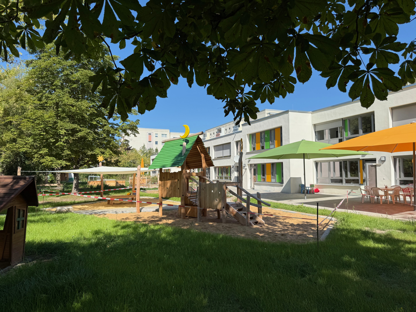 Im Spielbereich ergänzt ein zentrales Spielelement aus Robinienholz das Angebot. In der separat abgetrennten Sandfläche befinden sich ein kleiner Sandkran sowie ein Sandspieltisch aus Holz. Ein Sonnensegel überspannt die Fläche; zusätzlich steht eine Outdoor-Hängematte zur Verfügung. Sämtliche Spielgeräte sind standortbezogen entworfen, im Werk vorgefertigt und vor Ort montiert.