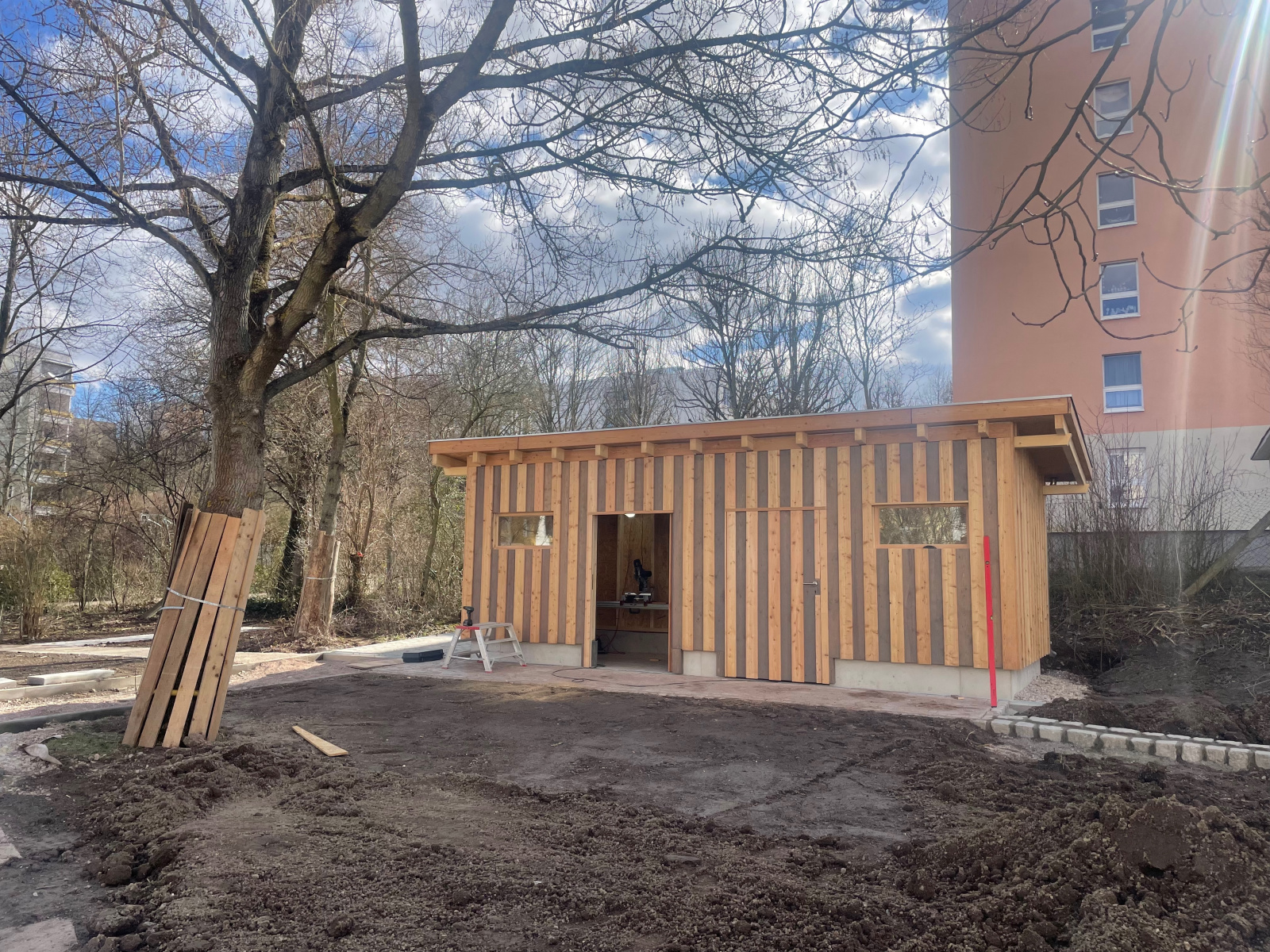 Am Fuß der Böschung standen mehrere Schuppen. Deren Rückbau machte Platz für einen zentralen, größeren Schuppen, der über einen Plattenweg erschlossen ist. Wie beim Jugendhaus erhält auch dieser ein extensives Gründach und eine Ausstattung mit Steckdosen sowie Beleuchtung.